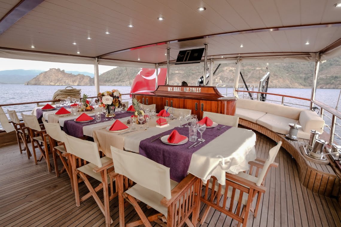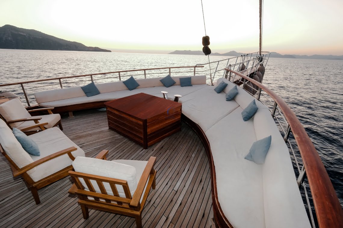Your days will revolve around the rhythm of the Aegean. Wake up to a gourmet breakfast prepared by your onboard chef, followed by a morning of windsurfing or kayaking in the crystal-clear waters of Göcek’s secluded bays. Unlike smaller vessels, the luxury gulet charter experience on Ada Deniz offers multiple distinct “zones” for relaxation: read in the shaded aft lounge, sip cocktails on the forward crescent seating, or enjoy a multi-course Mediterranean dinner under the stars. With 2x 500HP engines, she cruises smoothly between destinations, ensuring your time is spent enjoying the destination, not just the transit.
