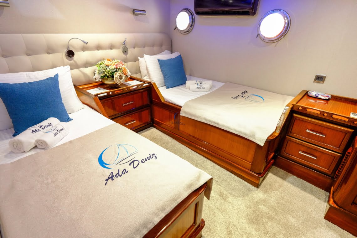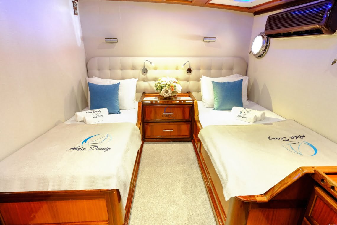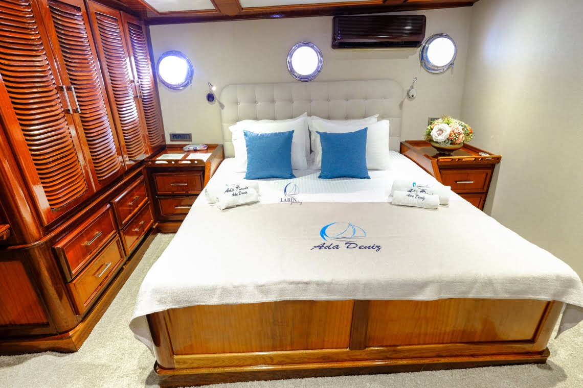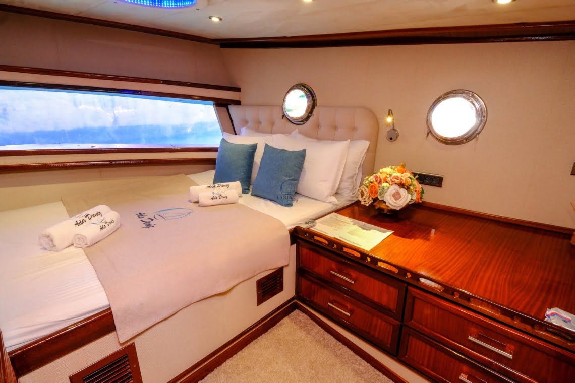 أ: Absolutely. Unlike many yachts that “squeeze” guests into small bunks, Ada Deniz was specifically engineered with 34 meters of length and 8 full-sized cabins (6 Double, 2 Twin). Each cabin features its own en-suite bathroom and independent A/C, ensuring 16 adults or large families have ample private and social space throughout the Fethiye and Göcek region.