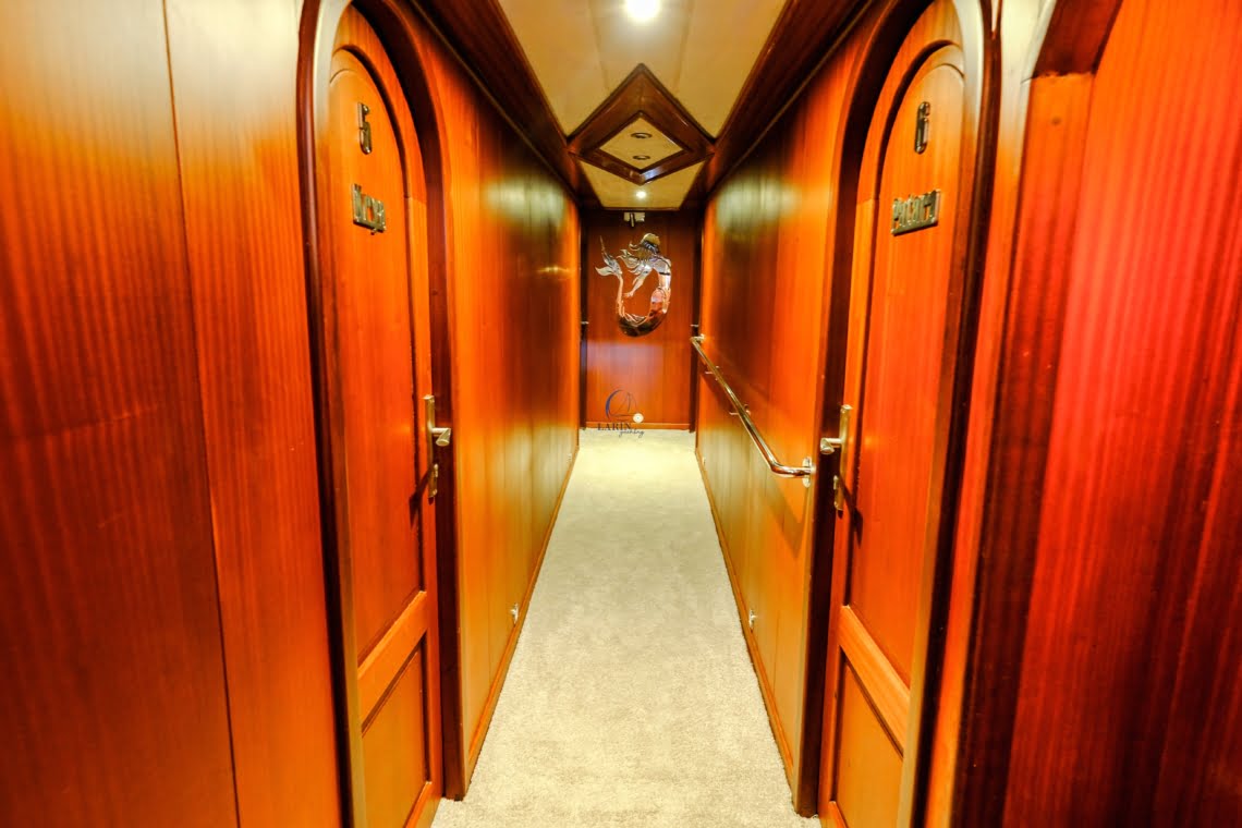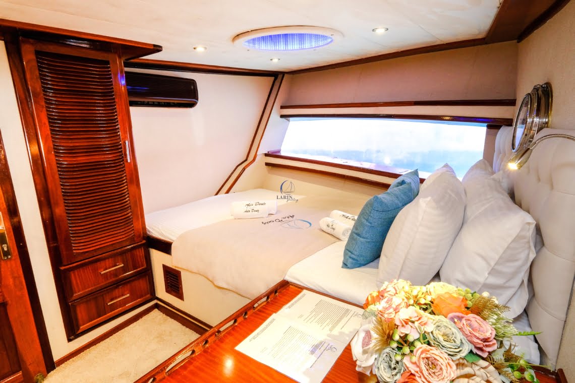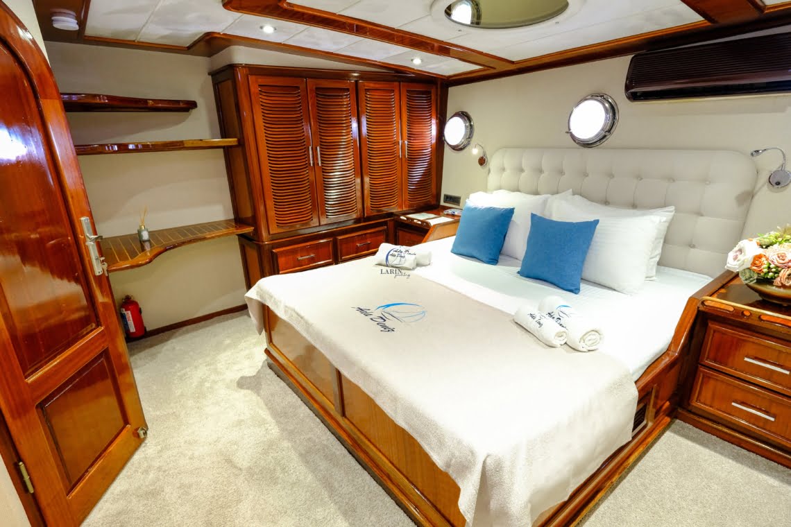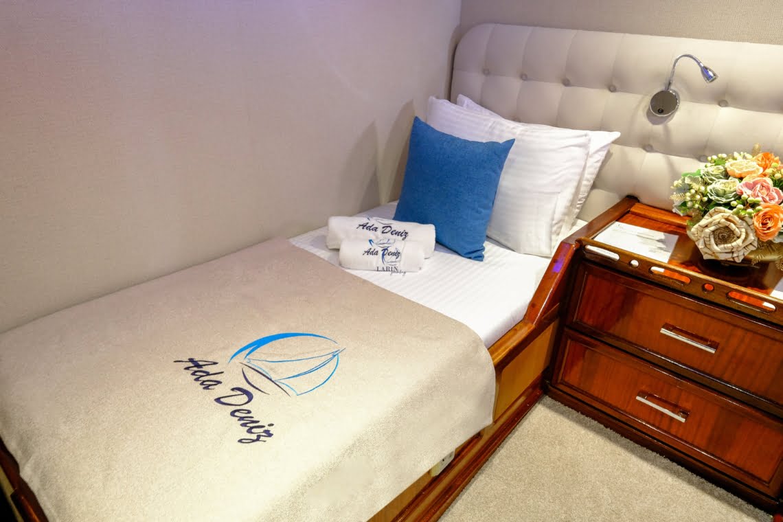 أ: Absolutely. Unlike many yachts that “squeeze” guests into small bunks, Ada Deniz was specifically engineered with 34 meters of length and 8 full-sized cabins (6 Double, 2 Twin). Each cabin features its own en-suite bathroom and independent A/C, ensuring 16 adults or large families have ample private and social space throughout the Fethiye and Göcek region.