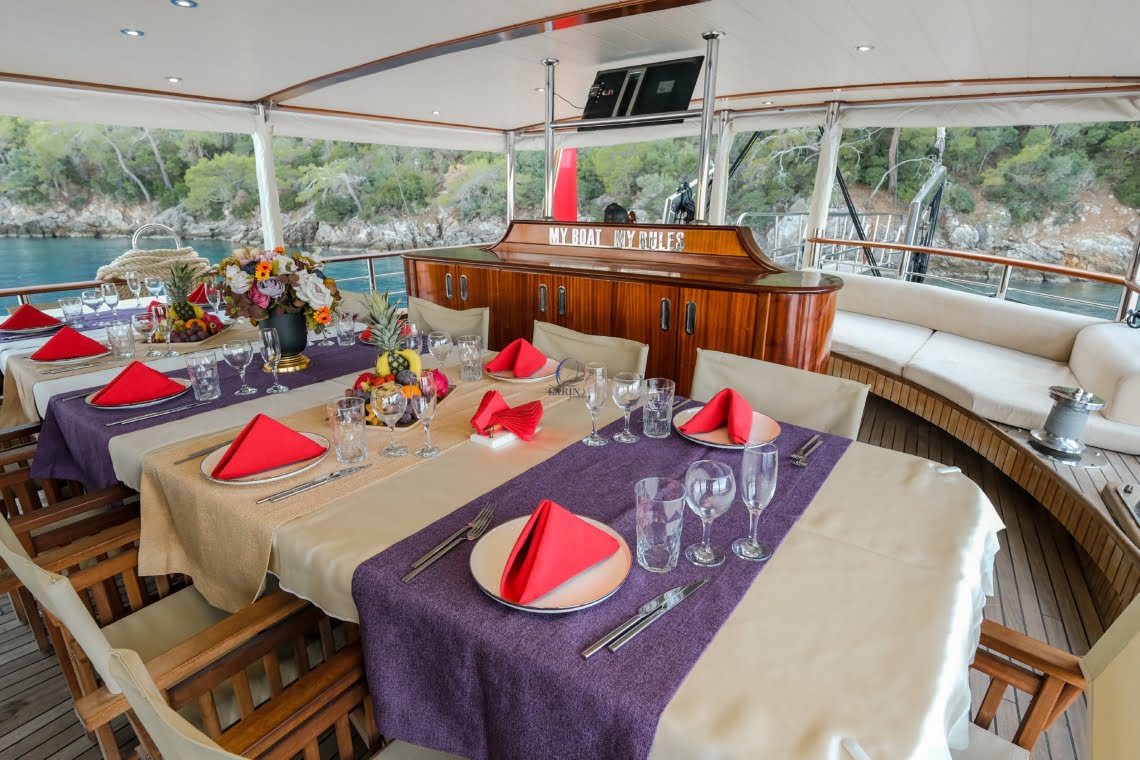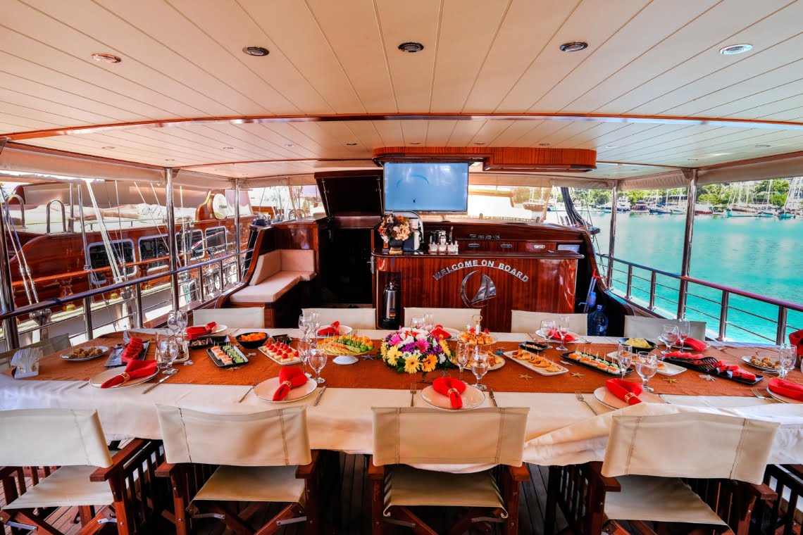أ: On a luxury vessel of this scale, the charter rate includes the crew, fuel for 3-4 hours of cruising daily, and Turkish port fees. Food and beverages are typically managed via a Full Board or Half Board supplement per person, or through an APA (Advance Provisioning Allowance) if you require bespoke, high-end provisioning similar to a mega-yacht experience.
