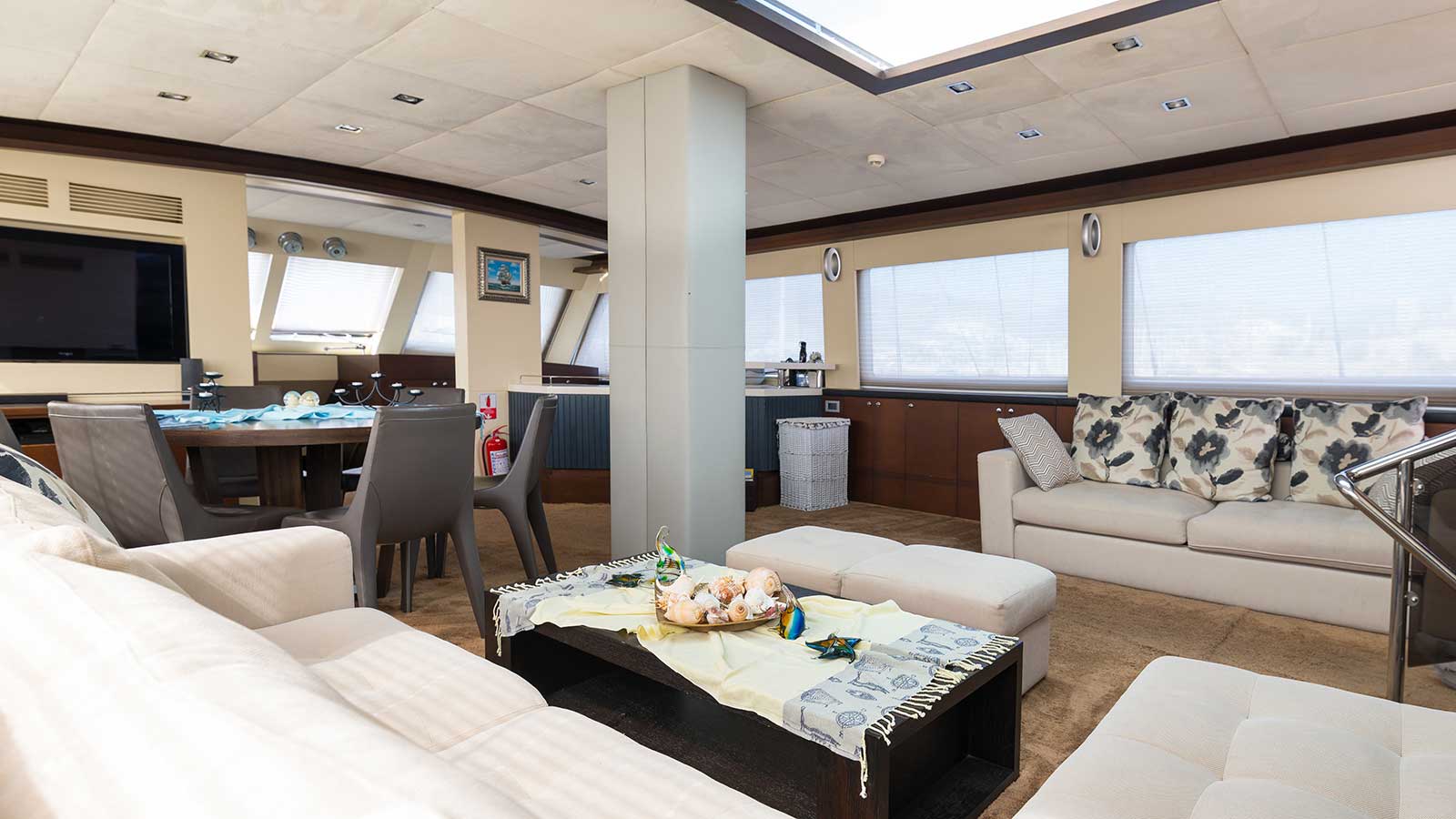 Im Inneren ist die Yacht mit moderner Technologie ausgestattet, darunter ein hochwertiges Bild- und Tonsystem und Internetdienst in türkischen Gewässern. Genießen Sie den Luxus von 24-Stunden-Klimaanlage während Ihrer Blauen Reise.