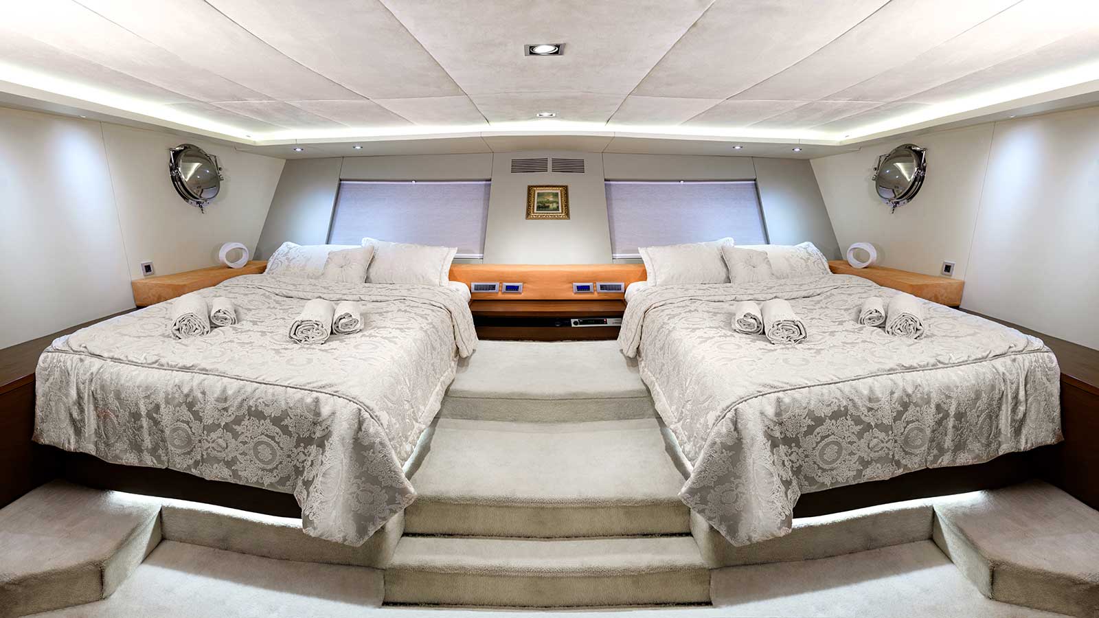 Der Doppeladler-Gulet ist ein prächtiges 38 Meter langes Luxusschiff, das Platz für bis zu 10 Gäste in seinen geräumigen 5 Kabinen. Dazu gehören zwei Masterkabinen (eines mit zwei Doppelbetten), zwei Doppelkabinen, Und eine Doppelkabine. Jede Kabine ist sorgfältig mit besonderen Möbeln und Teppichböden ausgestattet, die für ein wahrhaft opulentes Gefühl sorgen.