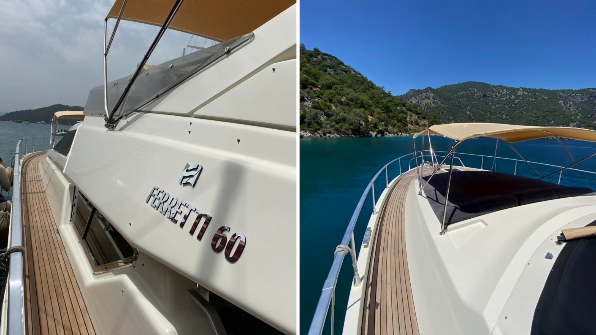 Ferretti 60 ist eine 3+1 Kabinen (eine Kabine ist für die Besatzung) Luxus-Motoryacht, die bis zu 6 Gäste für erstaunliche Yachtcharter rund um das östliche Mittelmeer aufnehmen kann, spezialisiert auf Göcek.