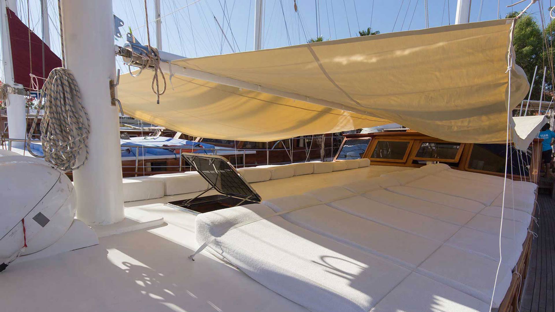 - Wassergeräte und Spielzeug – Kanu, Schnorchelausrüstung, Angelausrüstung, Sonnenmatratzen, Sonnensegel für Schatten vor der Gulet, Freizeitbereich auf der Rückseite des Decks, Deckdusche.