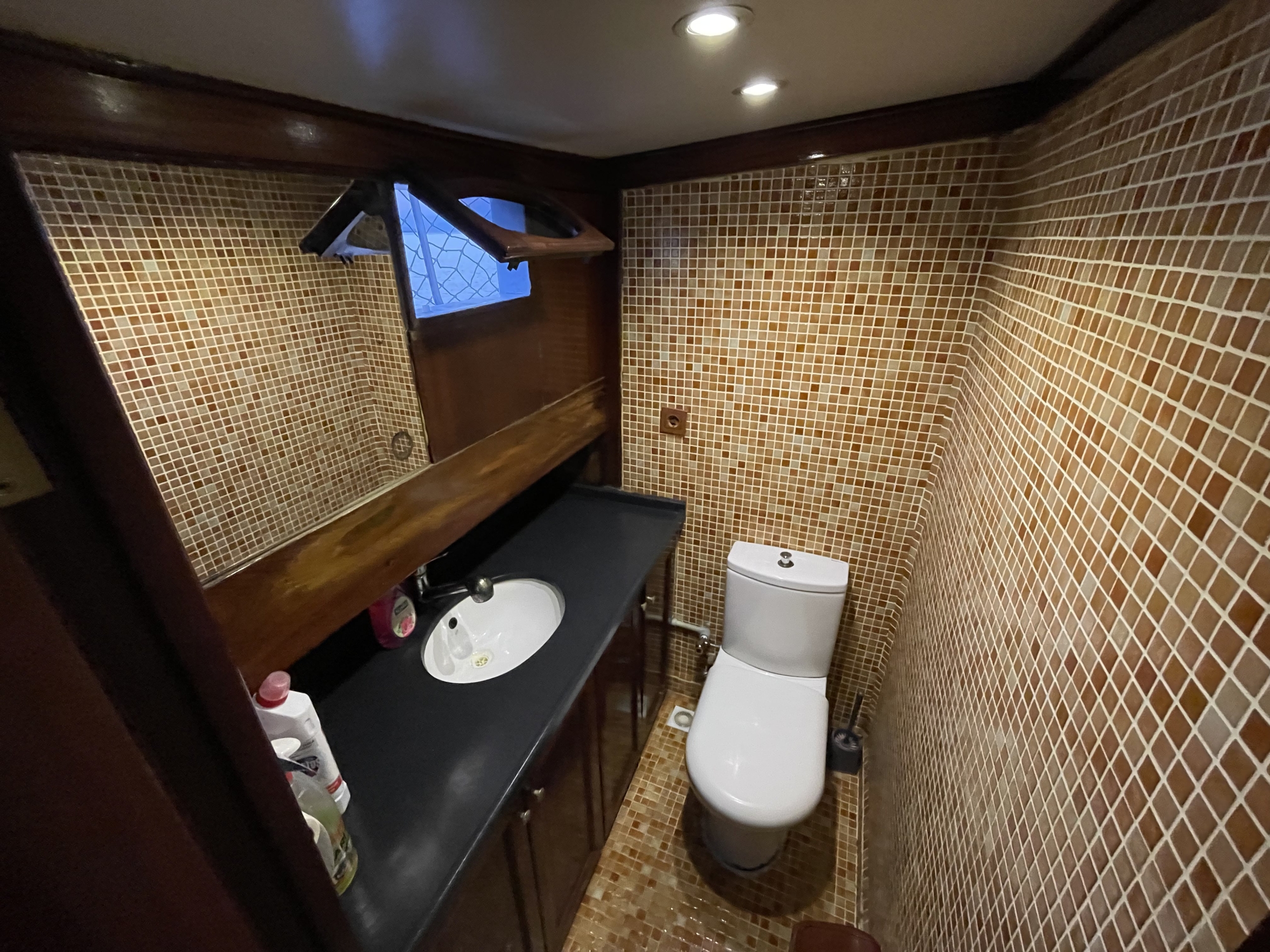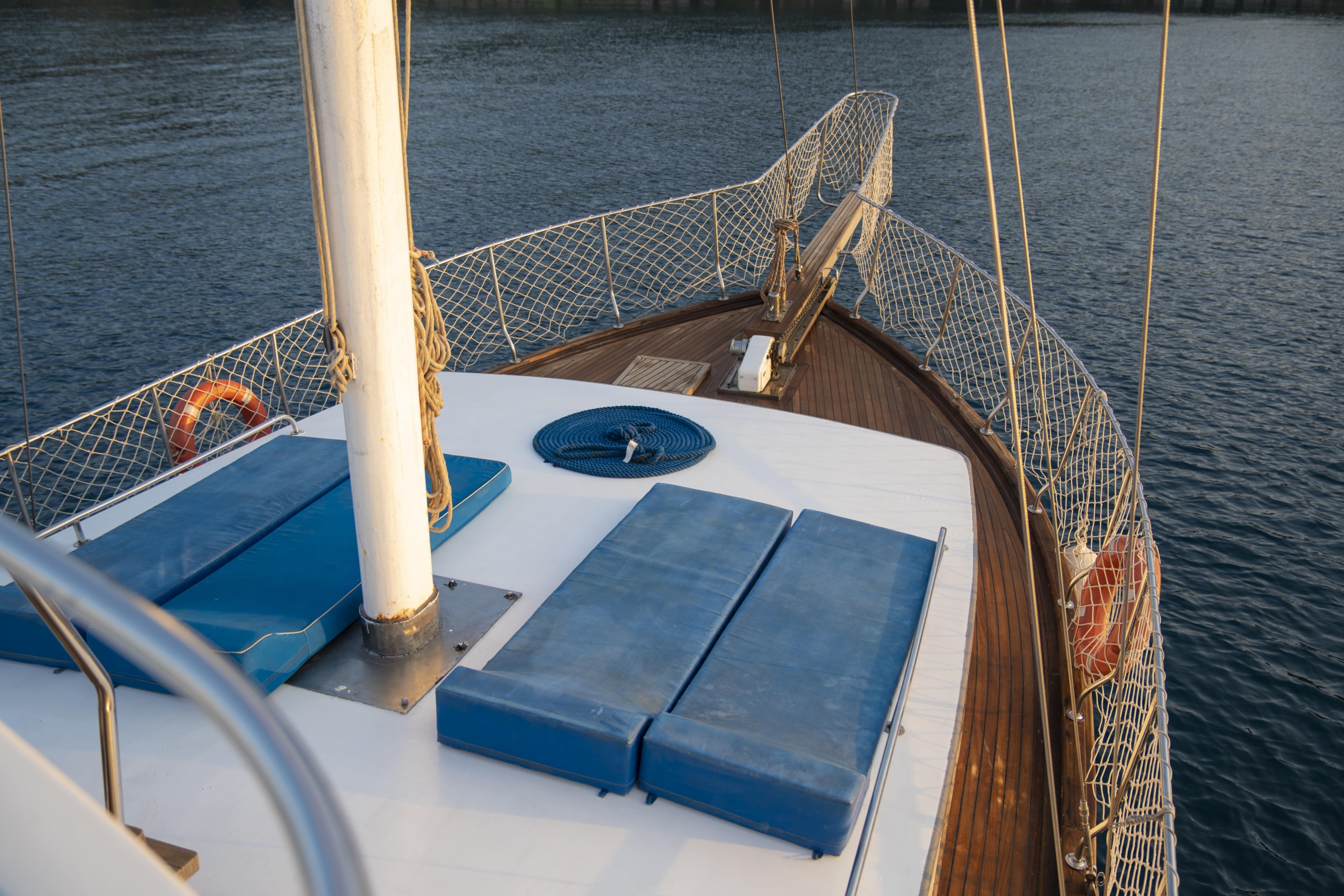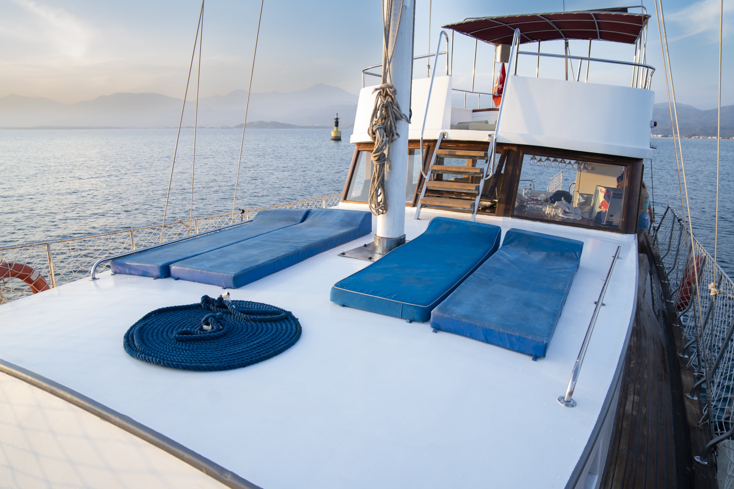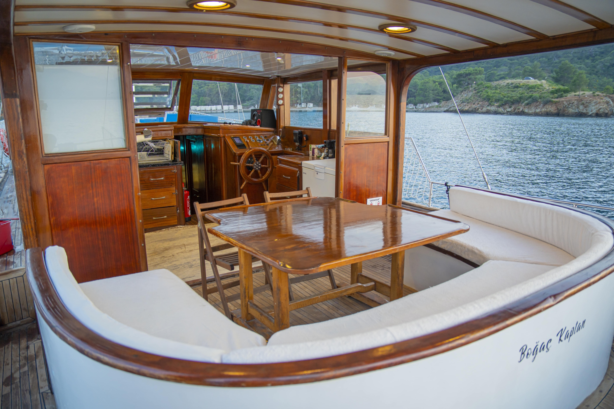 Boğaç Kaptan: Alquiler de goletas en Gocek, Fethiye: Nuestra goleta cuenta con dos camarotes para invitados, uno doble y uno principal para cuatro personas. El camarote de la tripulación, la ducha y el lavabo están separados.