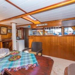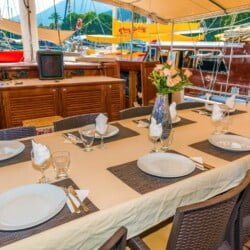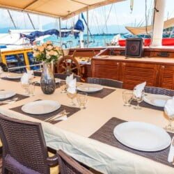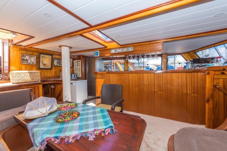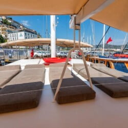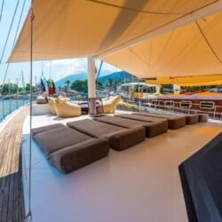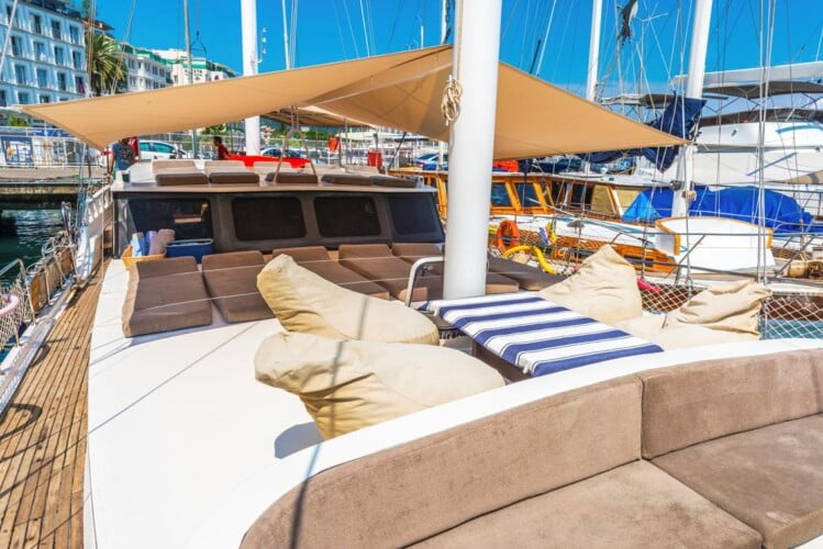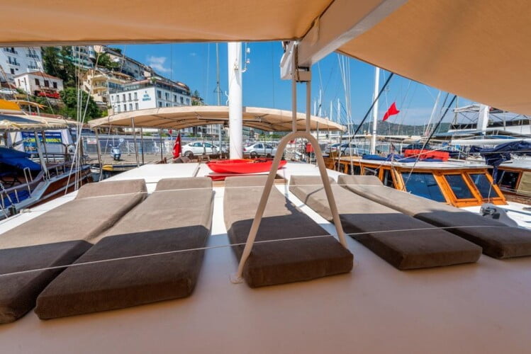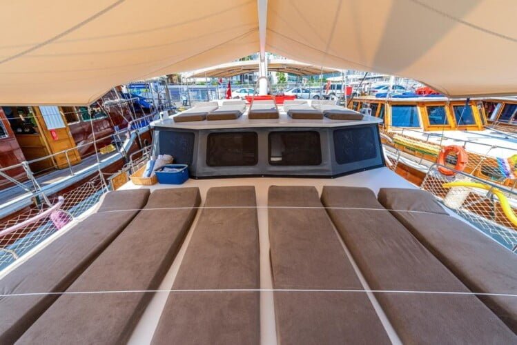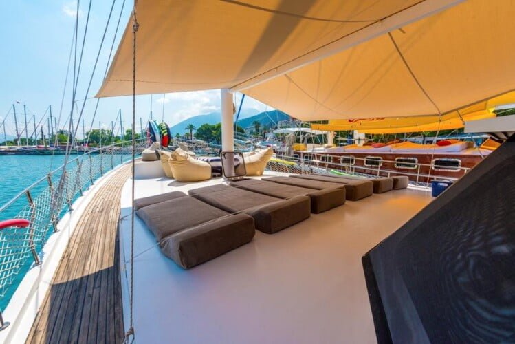 יש פינת ישיבה גדולה בסיפון האחורי, כריות נוחות, שולחן אוכל ופינת אוכל פרטית. יש שולחן אוכל נפרד בסלון והארוחות מוכנות במטבח מאובזר. Gulet Nomade מסודר כדי לספק כריות שיזוף בשפע ומקום לכל האורחים.
