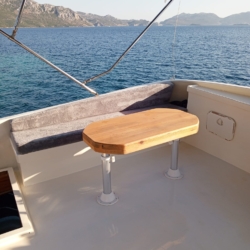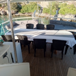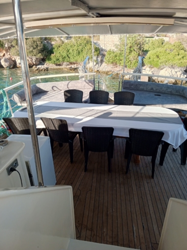 Špil: “Stol za blagovanje na otvorenom na stražnjoj palubi jahte Junior Irfan.”