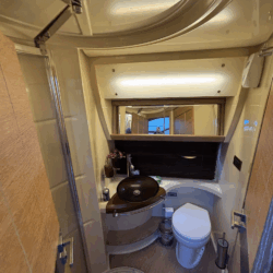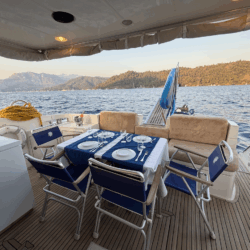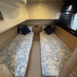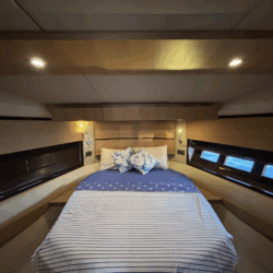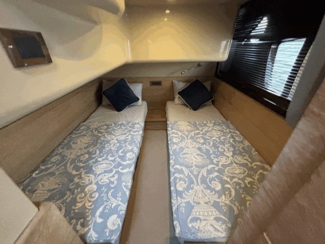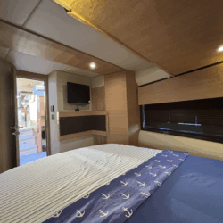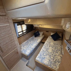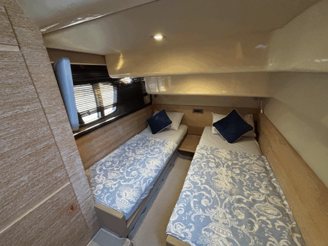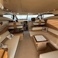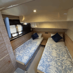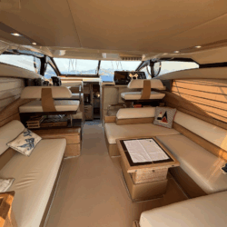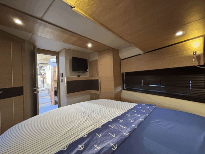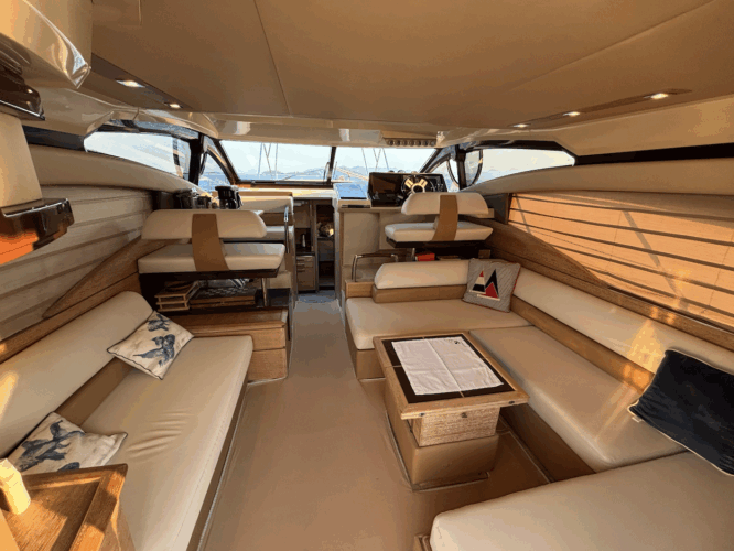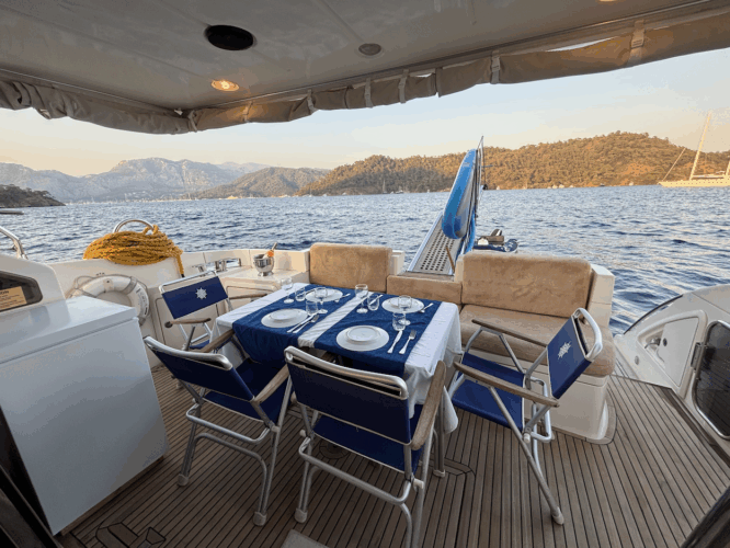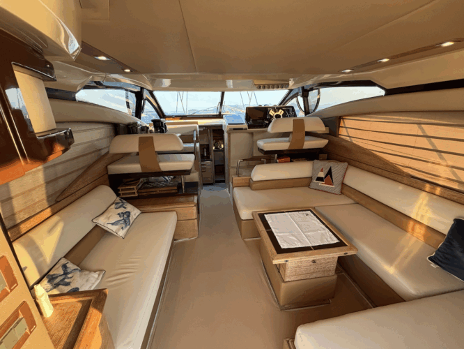 Unutrašnjost je svetište svjetla i luksuza. Salon otvorenog tlocrta odiše finom kožnom oblogom i završnim obradama od trešnjinog drveta, a vodi do potpuno opremljene kuhinje. Veliki panoramski prozori osiguravaju da nikada ne izgubite iz vida zadivljujuću tursku obalu, čak i dok se opuštate u klimatiziranoj udobnosti. Za noćenja jahta nudi tri prekrasno uređene kabine, uključujući prednju Master suitu koja parira smještaju u hotelima s pet zvjezdica.