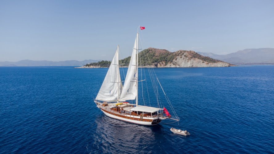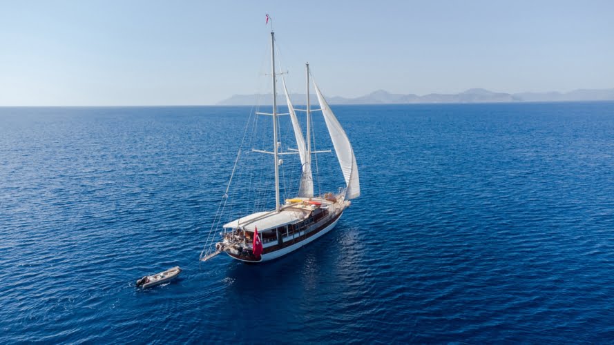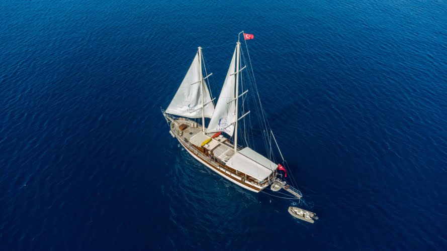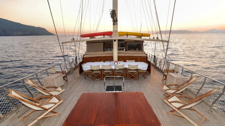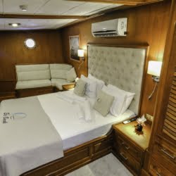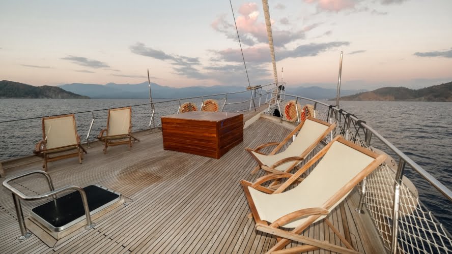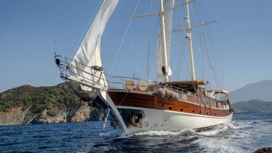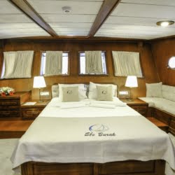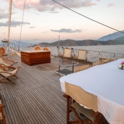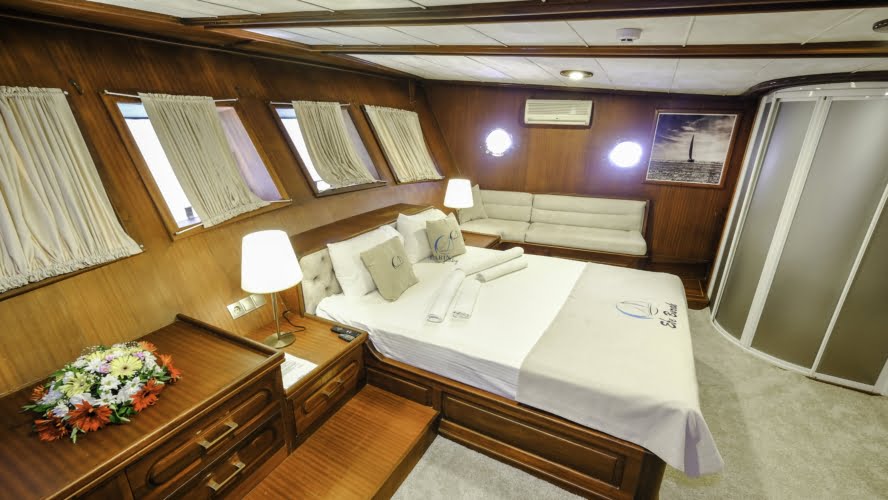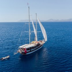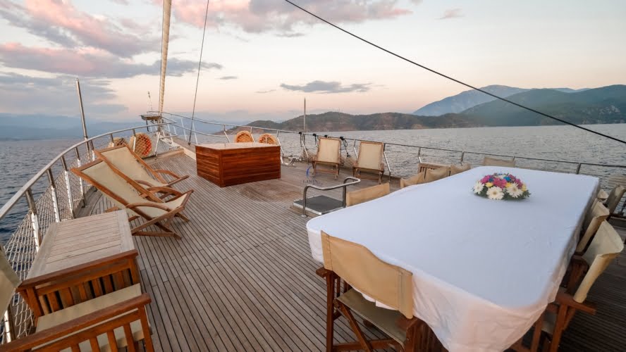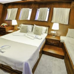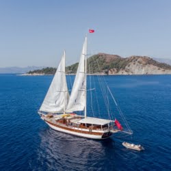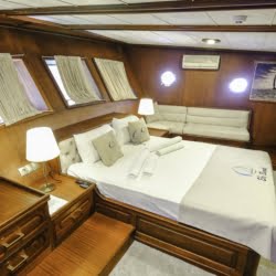 Caicco a noleggio di lusso a noleggio con 6 cabine e 12 persone Il caicco lungo 30 metri ti offre uno spazio confortevole in cabina con 2 cabine principali, 2 cabine doppie e una cabina per 3 persone. Ogni cabina è dotata di doccia e WC, aria condizionata e asciugacapelli. Sul ponte ci sono aree relax con tavolo da pranzo nella parte posteriore e lettini prendisole nella parte anteriore. Con il nostro yacht, che ha un equipaggio di 4 persone, possiamo partire da diversi punti su un ampio percorso da Fethiye, Gocek e Marmaris.