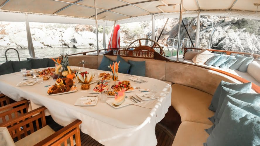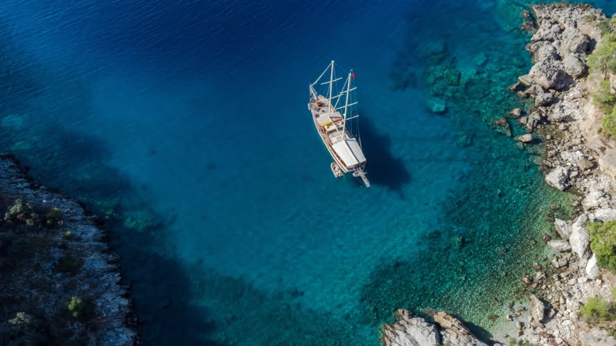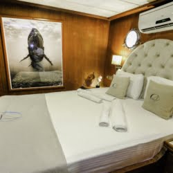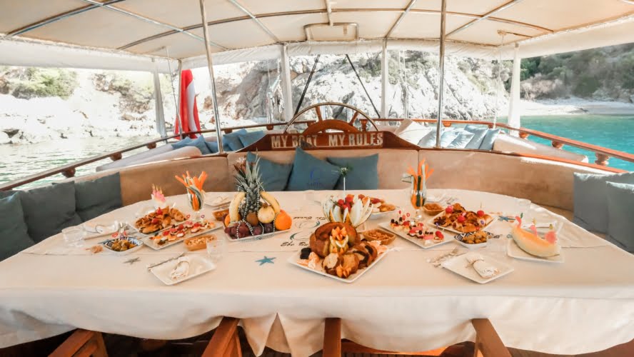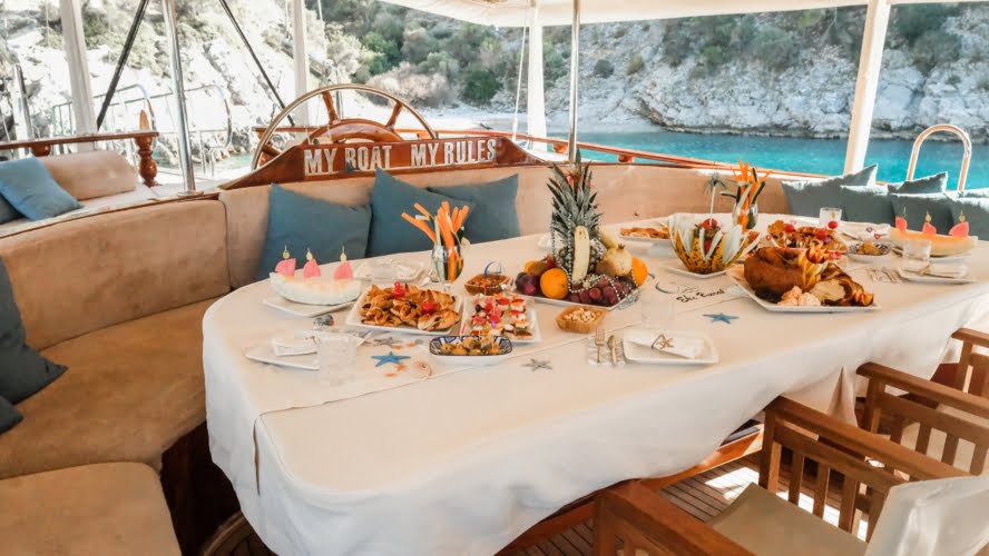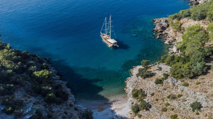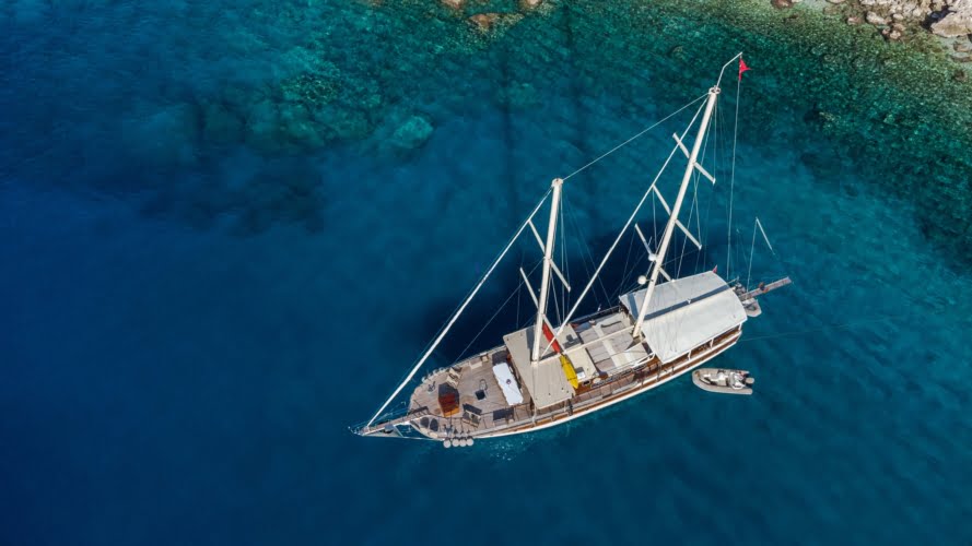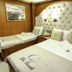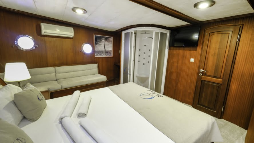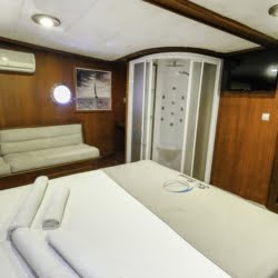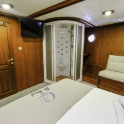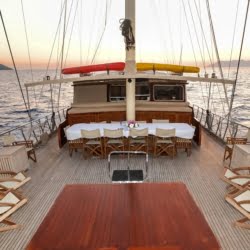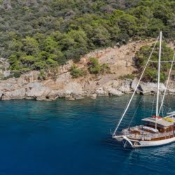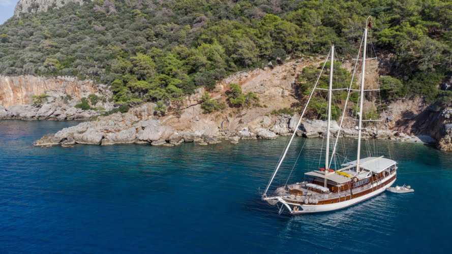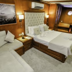 Caicco a noleggio di lusso a noleggio con 6 cabine e 12 persone Il caicco lungo 30 metri ti offre uno spazio confortevole in cabina con 2 cabine principali, 2 cabine doppie e una cabina per 3 persone. Ogni cabina è dotata di doccia e WC, aria condizionata e asciugacapelli. Sul ponte ci sono aree relax con tavolo da pranzo nella parte posteriore e lettini prendisole nella parte anteriore. Con il nostro yacht, che ha un equipaggio di 4 persone, possiamo partire da diversi punti su un ampio percorso da Fethiye, Gocek e Marmaris.