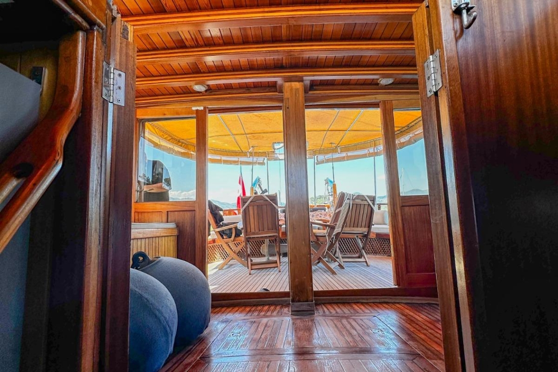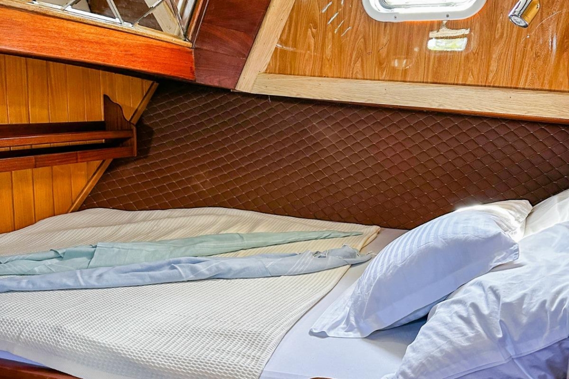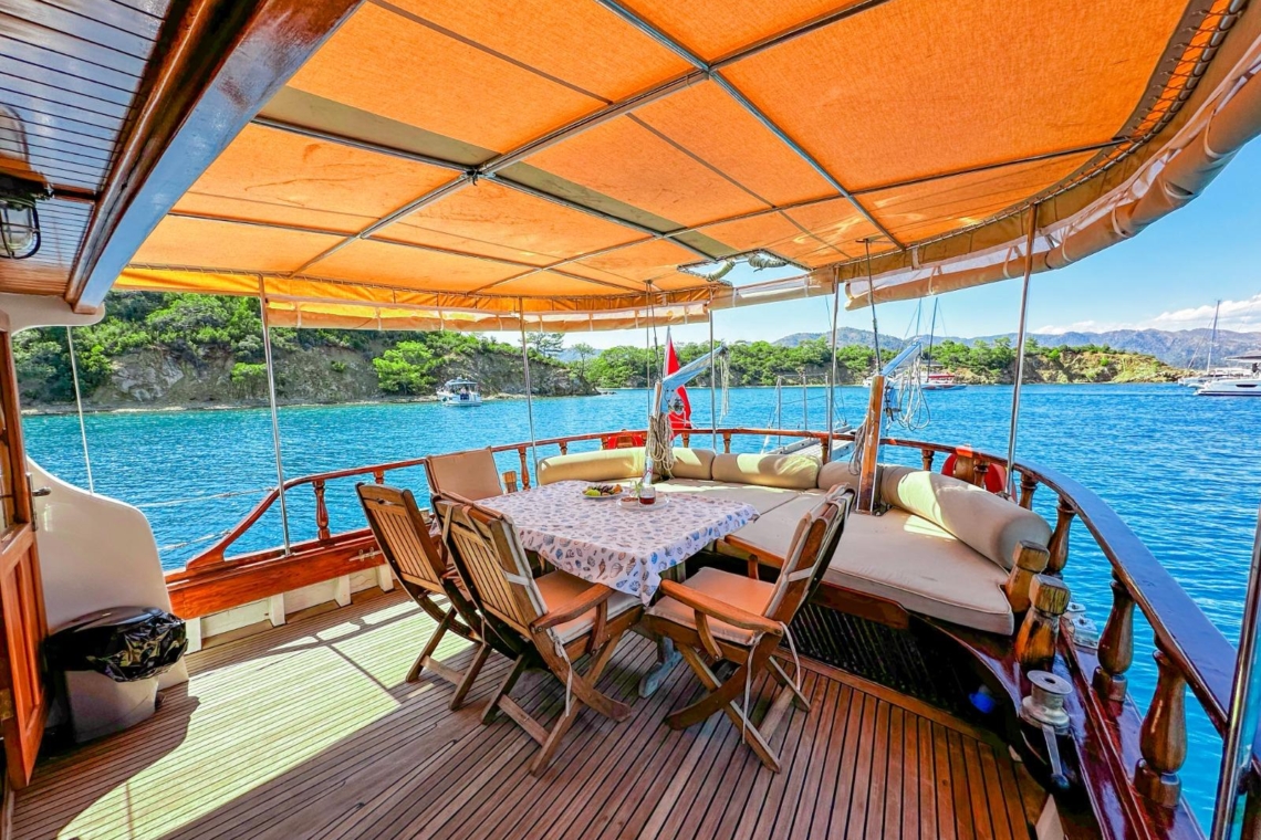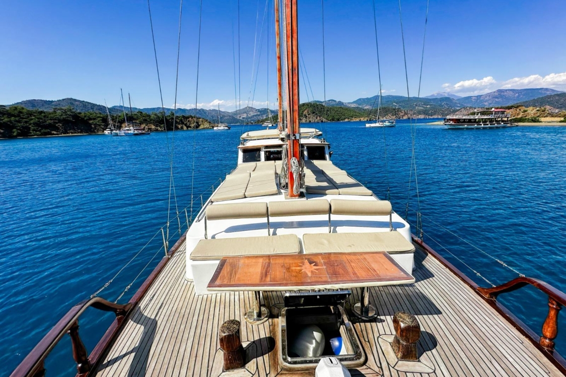 Je reis begint in de wereldberoemde baaien van Gocek. Stel je voor dat je wakker wordt in een van de drie elegant ingerichte tweepersoonshutten, elk met een eigen badkamer en airconditioning. Na een ochtendduik in het turquoise water geniet je van een door de chef bereid ontbijt op het ruime achterdek. Het zonovergoten voordek lonkt met comfortabele ligmatten, perfect voor middagdutjes of het bekijken van de zonsondergang met een glas lokale wijn.