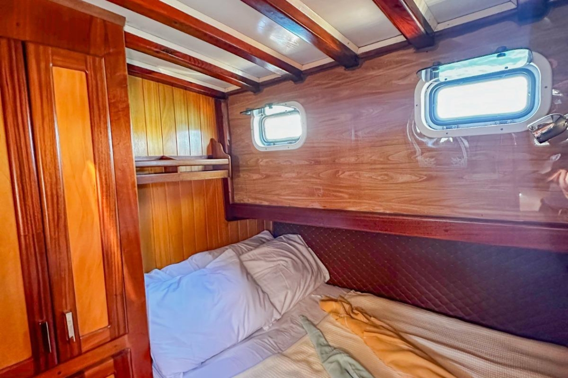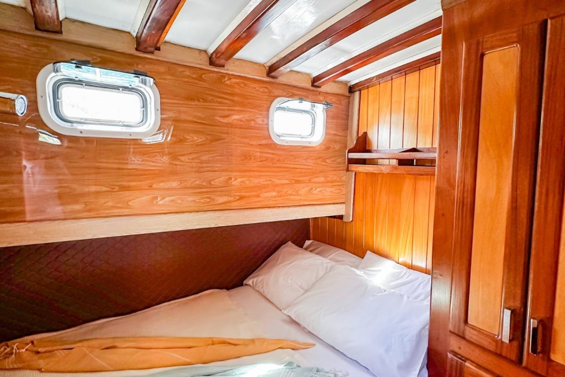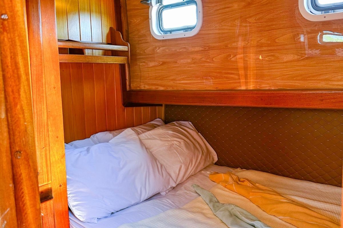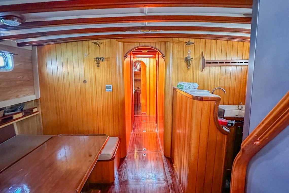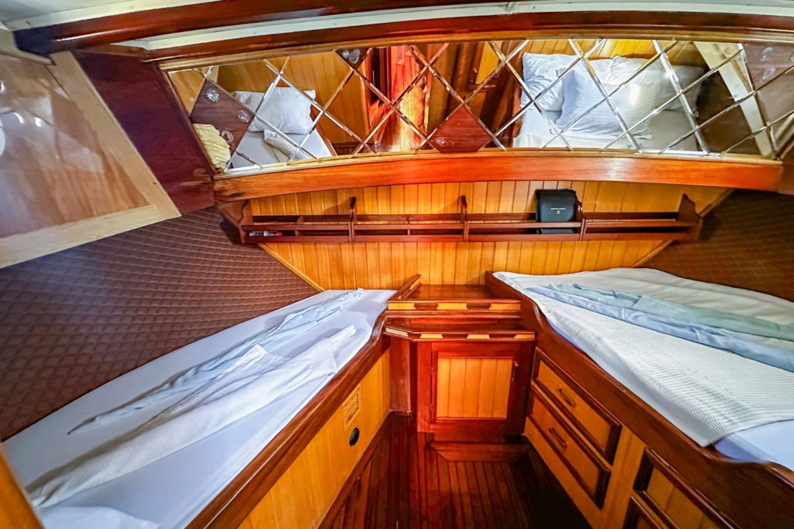 Je reis begint in de wereldberoemde baaien van Gocek. Stel je voor dat je wakker wordt in een van de drie elegant ingerichte tweepersoonshutten, elk met een eigen badkamer en airconditioning. Na een ochtendduik in het turquoise water geniet je van een door de chef bereid ontbijt op het ruime achterdek. Het zonovergoten voordek lonkt met comfortabele ligmatten, perfect voor middagdutjes of het bekijken van de zonsondergang met een glas lokale wijn.