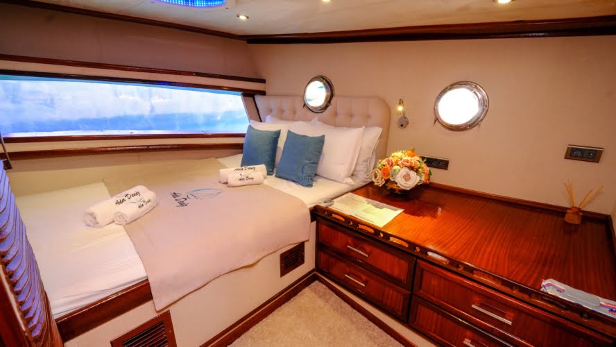 Ada Deniz: 8 Cabins 16 Pax Lux Charter Gulet is 34 meters long, has a total of 8 cabins and can accommodate up to 16 people. Each cabin has a shower, WC and air conditioning. You can have fun windsurfing on our yacht and relax by fishing. You can realize your dreams on this yacht, which is specially designed for blue cruises.