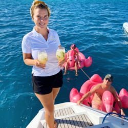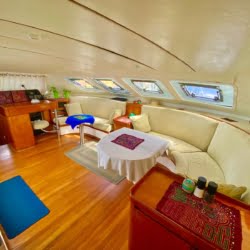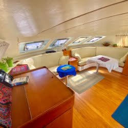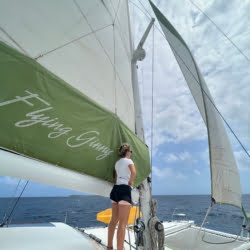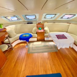 Flying Ginny is an elegant Lagoon 55 catamaran with loads of interior and deck space. Guests will immediately feel at home when they step aboard as she offers a unique blend of luxury and comfort. There is a huge salon and four private staterooms with an en-suite shower and toilets. The aft deck offers comfortable al fresco dining for up to eight people and plenty of room to find your favorite spot for relaxing in the shade or sunbathing when underway.