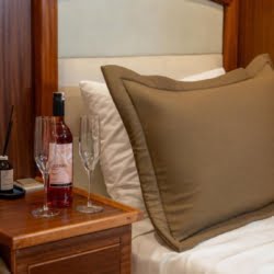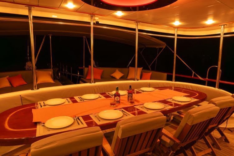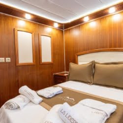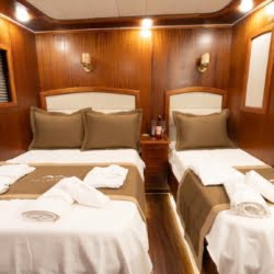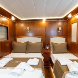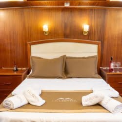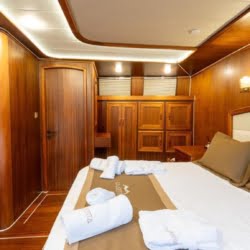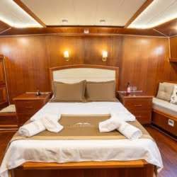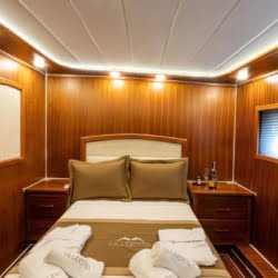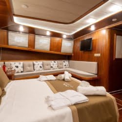 With this Luxury Gulet Spacious cabins significantly enhance your comfort, providing a range of standard amenities such as a toilet, bathroom, air conditioning, TV unit, shower cabin, wardrobe, hairdryer, hair conditioner, shampoo, soap, and slippers. The beds, towels, and sheets in the cabins are elegant.