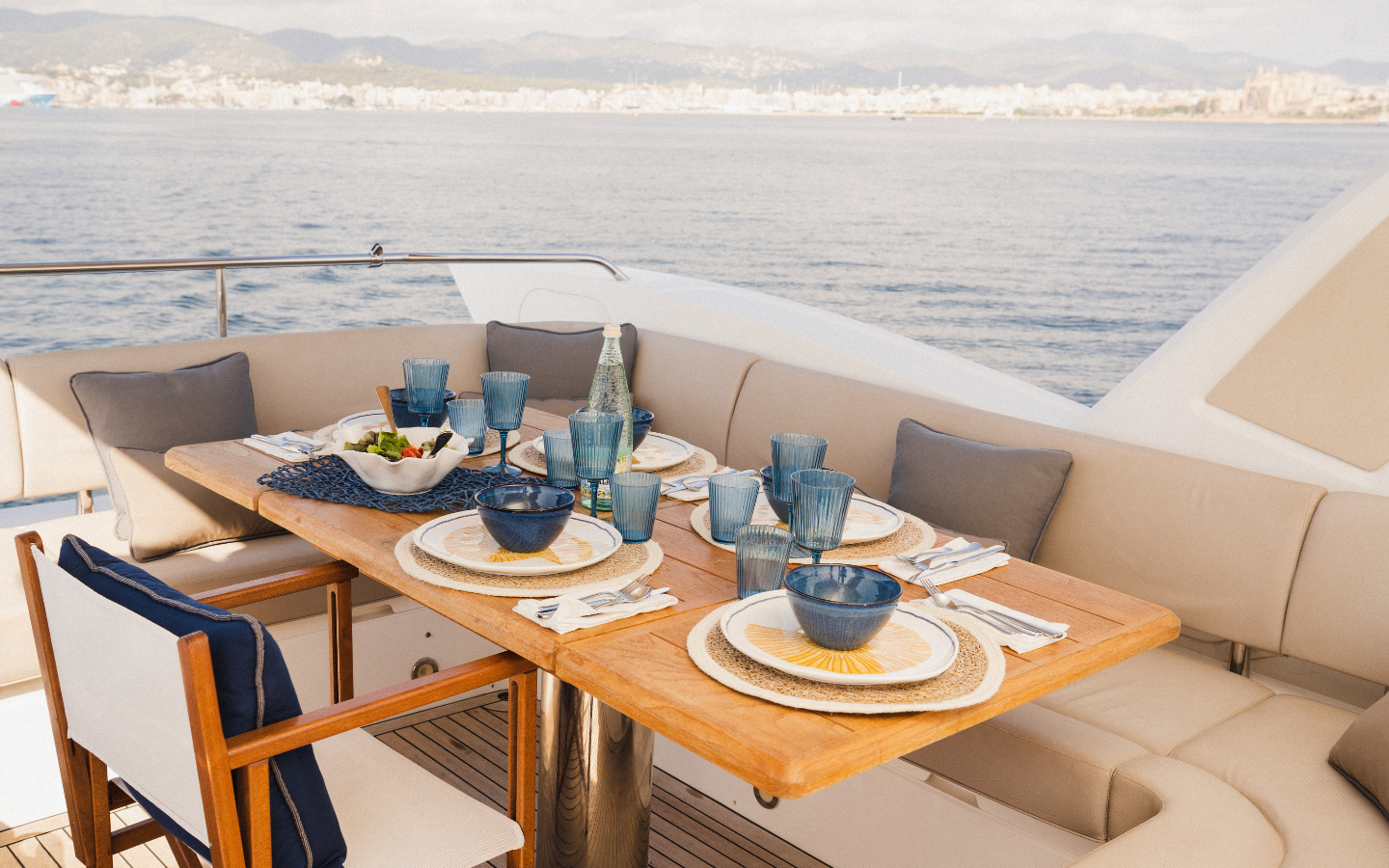 The yacht departs from Palma de Mallorca, a privileged port in the Mediterranean. From here, guests can visit hidden coves and crystal-clear beaches such as Cala Blava or Cala Pi, as well as seaside restaurants offering local cuisine.