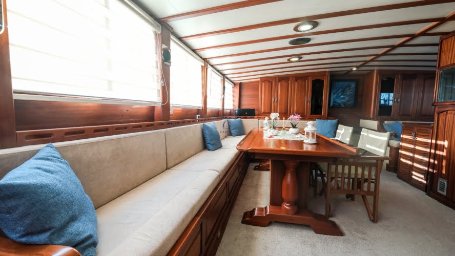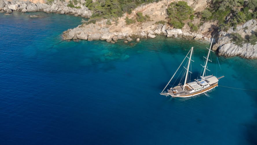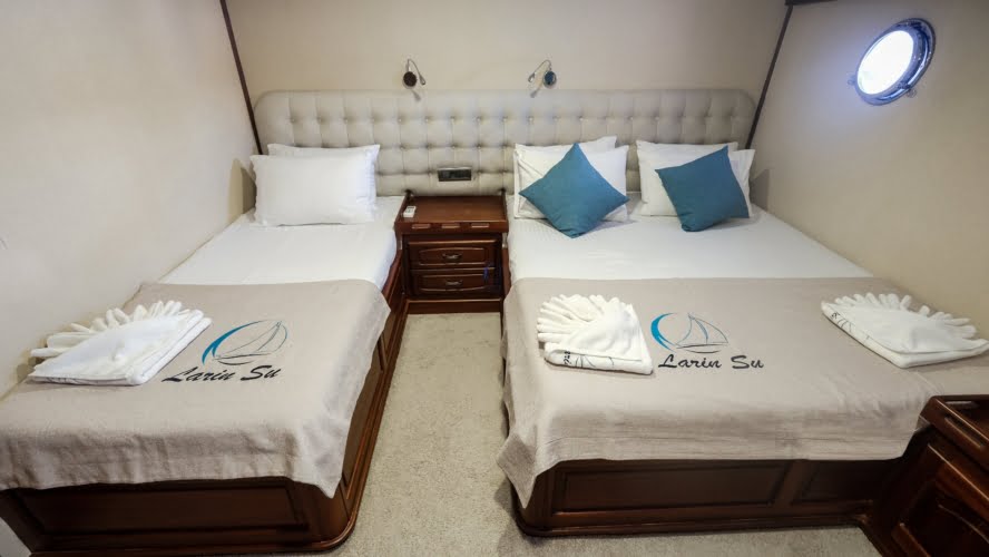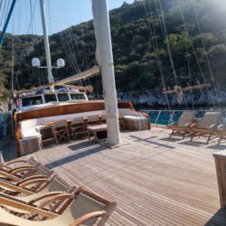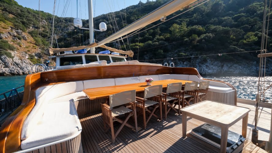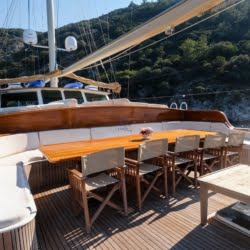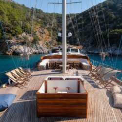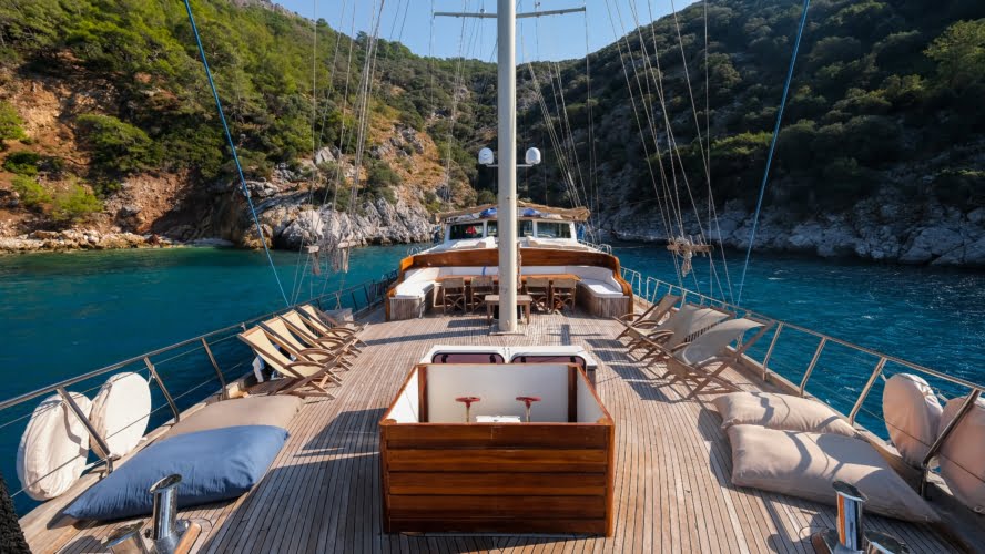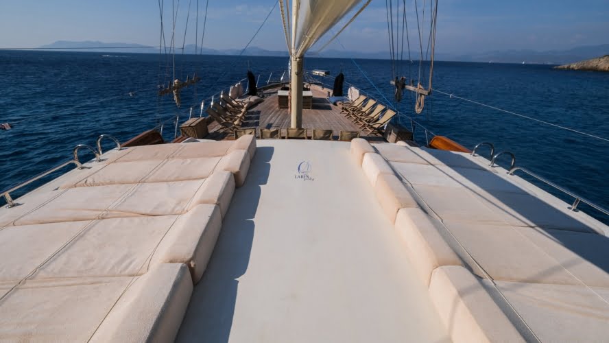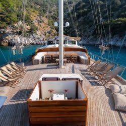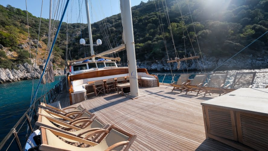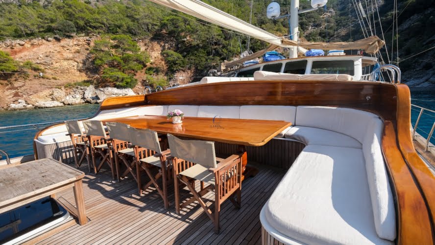 The deck offers ample living space to relax, spend time, and view the stunning Turkish coastline. The crew at Larin Su will accompany you throughout your tour.