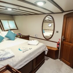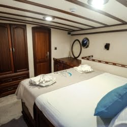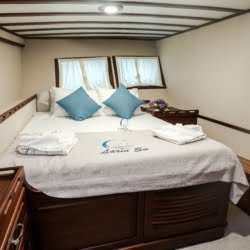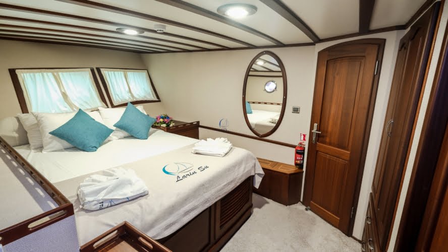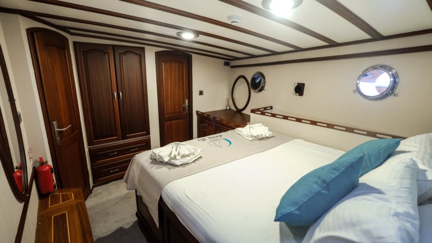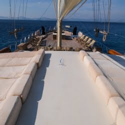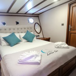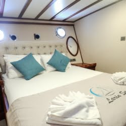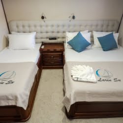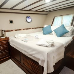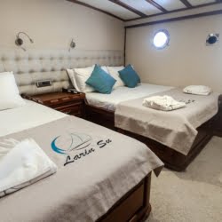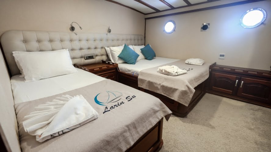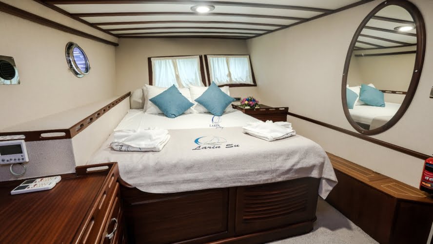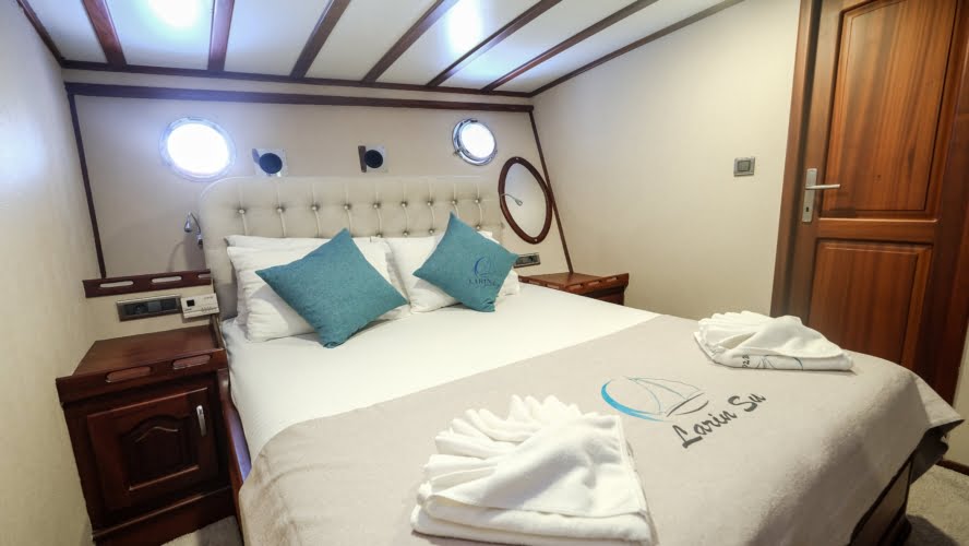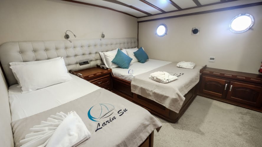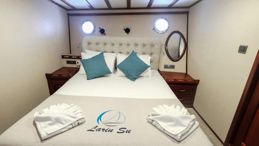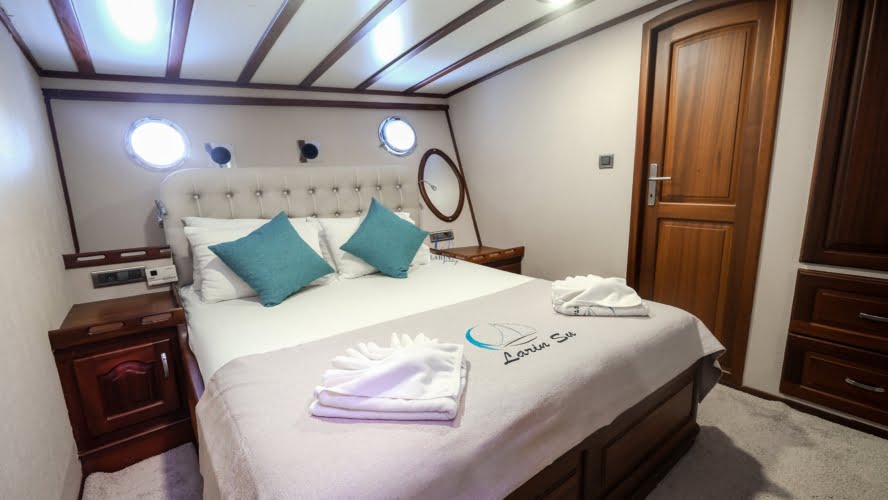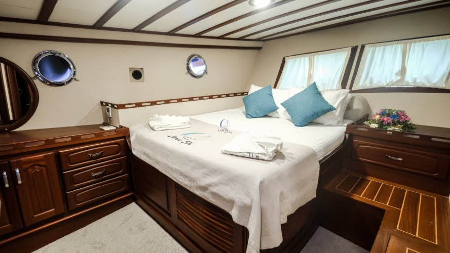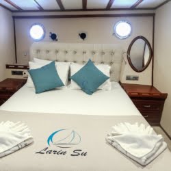 Larin Su: 8 Cabins 16 Pax Capacity Luxury Charter Gulet Rental Turkey is a traditional wooden gulet available from Fethiye, Marmaris, and Bodrum for your yacht holidays in Turkey. Our 31-meter-long gulet is ideal for larger groups of families and friends, as it can accommodate 16 guests in a total of 8 cabins, 5 of which are double and 3 with single beds. Each cabin has air conditioning and a private bathroom with a shower and a home-style toilet. The stylish lounge is the perfect refuge from the heat of the midday sun. Relax with a book, enjoy a refreshing drink at the bar, watch TV, or listen to music.