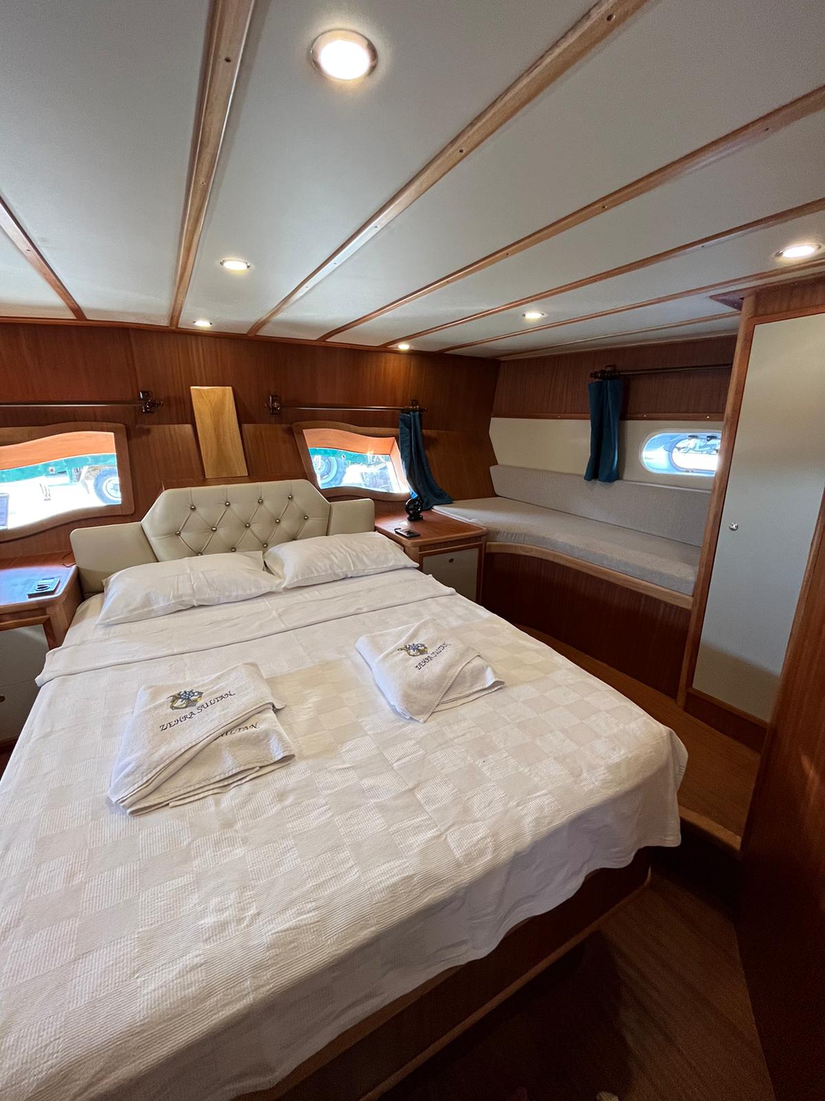 Zehra Sultan Gulet 建于 2007 年,长 24 米,宽 6.80 米,于 2017 年以现代化的方式进行了全面翻新,形成了现在的模样。它可以在 8 个双人舱中容纳 16 位客人。我们的船舱结构宽敞、现代,配有淋浴和卫生间。您可以在船尾甲板或休息室的时尚餐桌上品尝我们设备齐全的厨房精心准备的餐点。甲板上有宽敞的坐垫区、日光浴区和足够数量的日光浴坐垫。您可以在游艇上开始最棒的水上运动,这里舒适的环境会让您有宾至如归的感觉。您可以在船上轻松找到专门为此准备的设备。钓鱼设备和浮潜设备等内容将让您以最佳方式享受大海。在通讯和安全方面,它的结构可以完全满足您的期望。船上有通讯设备、指南针、全球定位系统、导航设备、深度计和电子地图等可供选择。